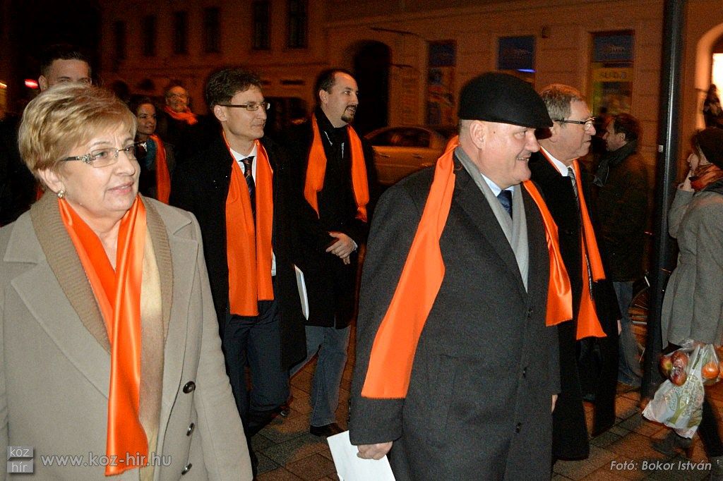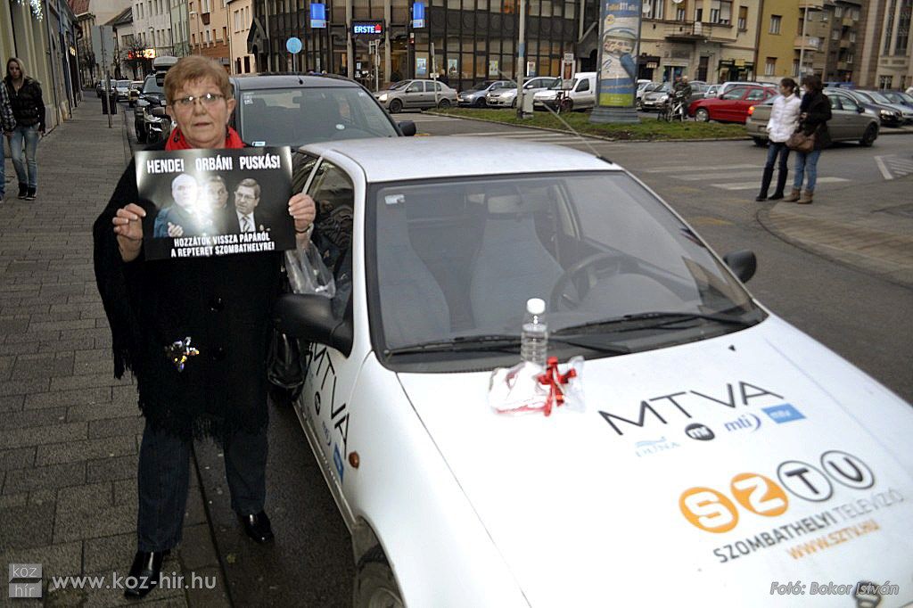 Hende Csaba, honvédelmi miniszter, Puskás Tivadar, Szombathely polgármestere negyed hat előtt nem sokkal érkezett a Savaria Mozihoz a Városházából a Fideszes tisztségviselők, többek között a drogügybe keveredett Lazáry Viktor alpolgármester társaságában. Mindnyájukon narancssárga sál lobogott. Talán ez lesz a Magyar Csapat „Nemzeti Öltözéke”? A tüntetők a delegáció közeledésére hangos fütyülésbe és skandálásokba kezdett. Többen a „porszívó” kifejezést kiabálták a Fideszes politikusok felé.