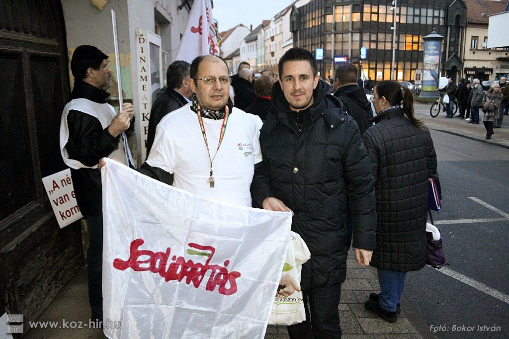 A baloldali tüntetők már 16 órától gyülekeztek. Transzparenseiken a következő feliratok voltak olvashatóak: „Hende! Orbán! Puskás! Hozzátok vissza Pápáról a repteret Szombathelyre!”, „#kösziOrbán”, „Itt hamarosan Nemzeti Dohánybolt nyílik”, „A népnek joga van elkergetni a kormányt…”, „Hende Csaba havonta 178 119 forinttal többet visz haza…”. A demonstrálók Orbán Viktor korábbi nyilatkozataiból is idéztek, melyekben határozottan elutasította a keletre nyitást. Ez azért érdekes, mert a napokban teljes titokban megegyezett Oroszországgal, ennek fényében pedig bővítik a paksi atomerőművet, melyhez 3000 milliárd forint kölcsönt vesznek fel.