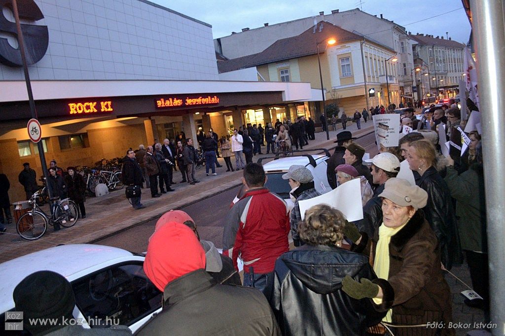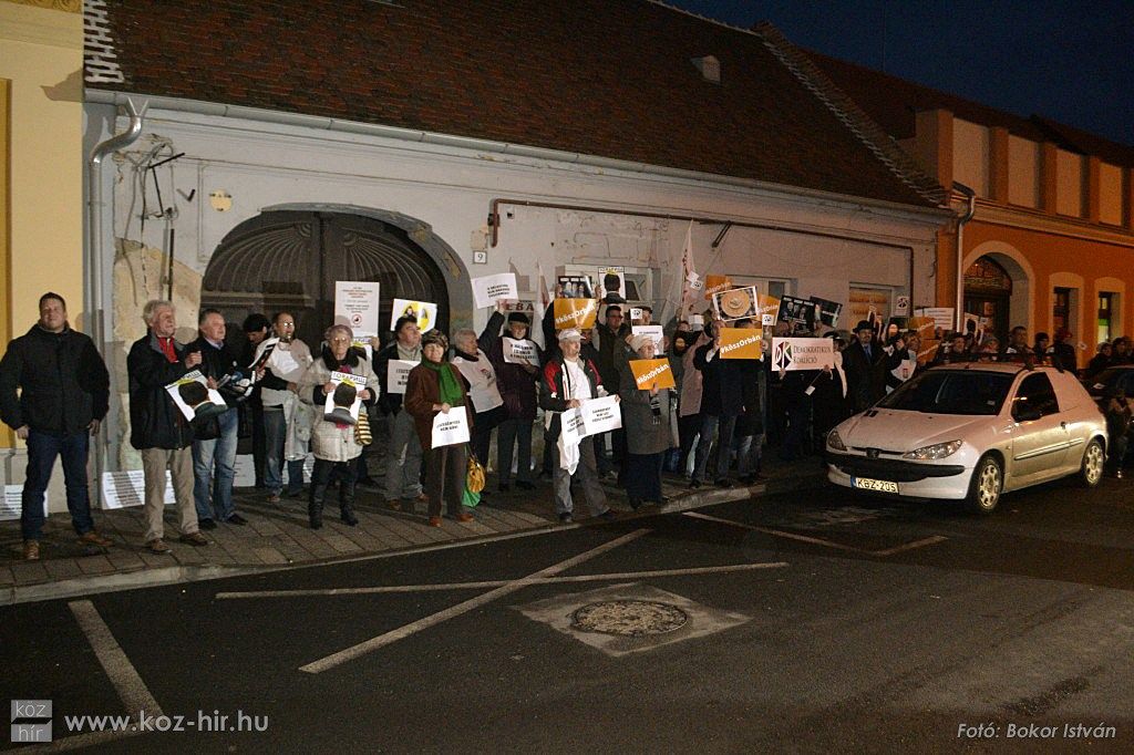 Tüntetők és a fórumra érkezők a Savaria Mozinál – Köz-Hír fotó: Bokor István