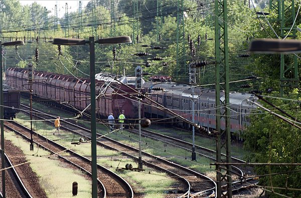 Két személyvonat áll egymással szemben Dunakeszin a jobb szélső vágányon 2014. július 19-én. A Szobról Budapest-Nyugati pályaudvarra tartó vonat eddig tisztázatlan körülmények között áthaladt a biztosítóberendezés vörös jelzésén és az egyik váltót felvágva szembement a Vác felé éppen induló személyvonattal. A vonatokat vészfékezéssel sikerült megállítani egymástól mintegy 40 méter távolságban. MTI Fotó: Lakatos Péter