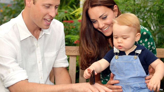 A hétfőn este közzétett két új hivatalos fotó egyikén a kis herceg édesanyja ölében ülve nyúl egy pillangó után, amely apja, Vilmos herceg kézfején pihen. A másik kép szintén szüleivel együtt ábrázolja Györgyöt, anyja tartja karjaiban, onnan figyel érdeklődve valami érdekes dologra. A fényképek a londoni Természettudományi Múzeumban készültek néhány hete.