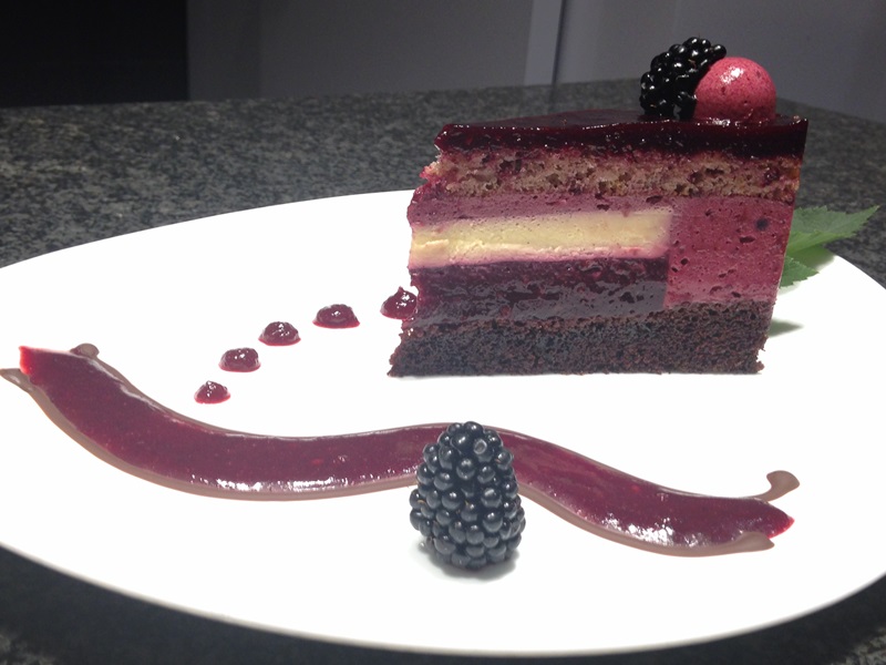 Szeletenként szedermousse félgömbökkel, szederszemekkel díszítjük.