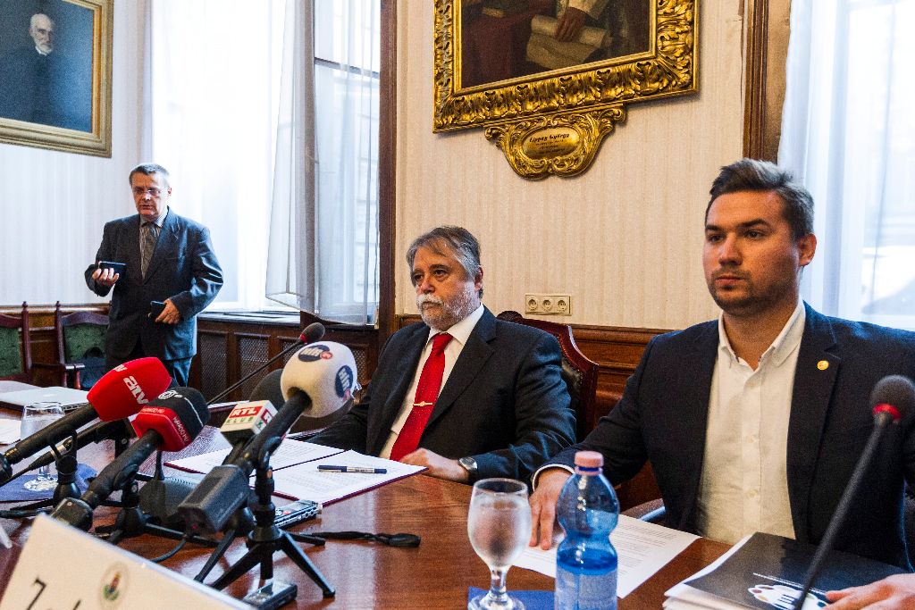 Mezey Barna, az Eötvös Loránd Tudományegyetem (ELTE) rektora (k), valamint Fábri György rektorhelyettes (b) és Zaránd Péter, az ELTE Egyetemi Hallgatói Önkormányzatának elnöke (j) az egyetemi gólyatáborokkal kapcsolatban tartott sajtótájékoztatón az ELTE dékáni tanácstermében 2014. szeptember 4-én.