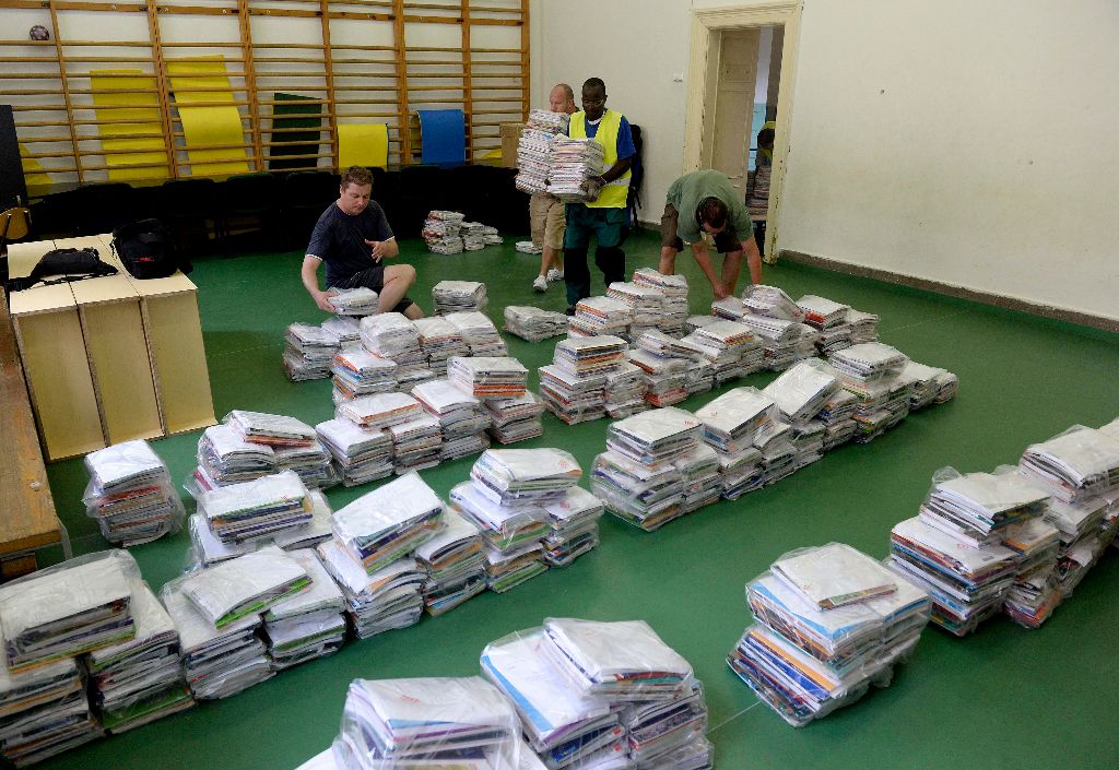 Sárközi László tanár, tankönyvfelelõs (b) ellenõrzi a beérkezett könyveket a budapesti I. kerületi Batthyány Lajos Általános Iskolában 2014. augusztus 6-án. Mintegy 1 millió 267 ezer diák számára kezdõdik meg alig egy hónap múlva a tanév. A megrendelt tankönyvek augusztus 30-ig megérkeznek az iskolákba.