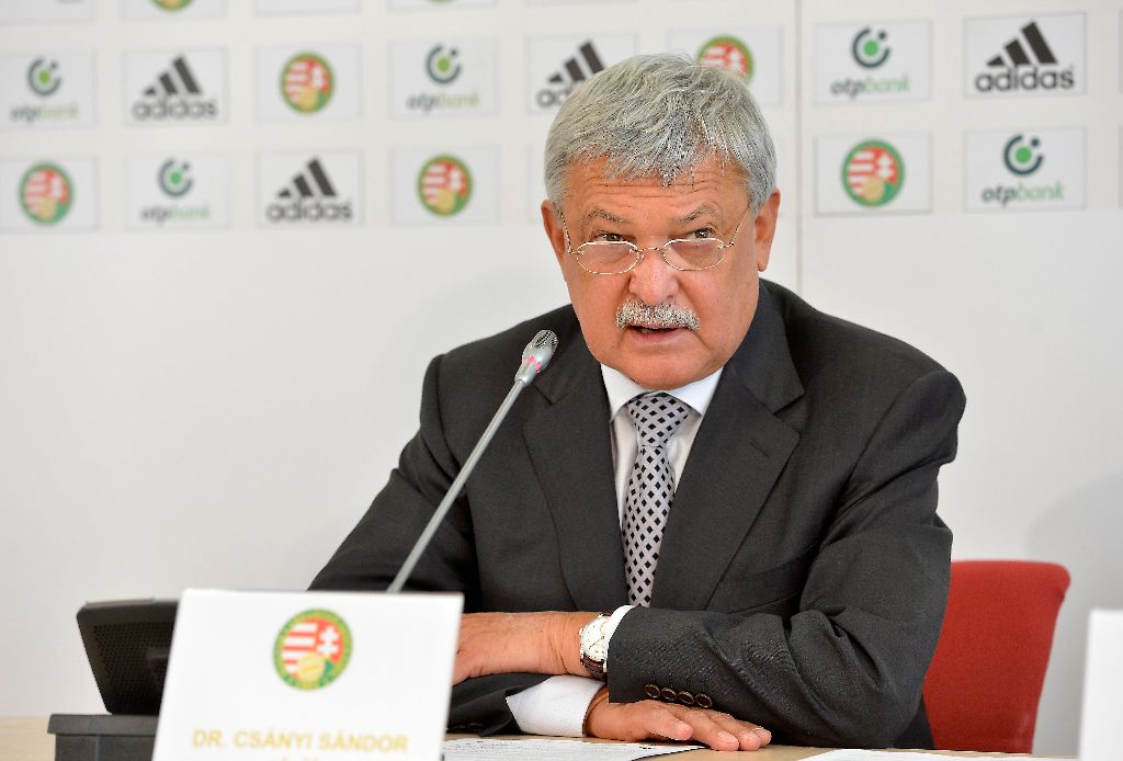 Csányi Sándor, a Magyar Labdarúgó Szövetség (MLSZ) elnöke sajtótájékoztatón beszél Budapesten, az MLSZ székházában 2014. szeptember 18-án, amelyen bejelentette, hogy távozik posztjáról Pintér Attila, a magyar labdarúgó-válogatott szövetségi kapitánya és a következõ három tétmérkõzésen Dárdai Pál irányítja a nemzeti csapatot.