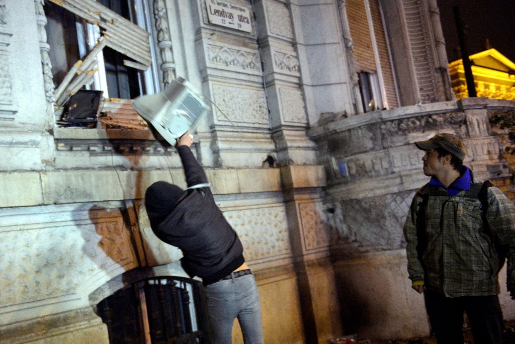 Budapest, 2014. október 26., vasárnap (MTI) – Az internetadó elleni vasárnap esti budapesti tüntetés végén a szervezők a Hősök terén elköszöntek a demonstrálóktól, a tüntetők egy része azonban a Lendvay utcai Fidesz-székházhoz ment, megdobálták az épületet, és más, erőszakos cselekmények is történtek.