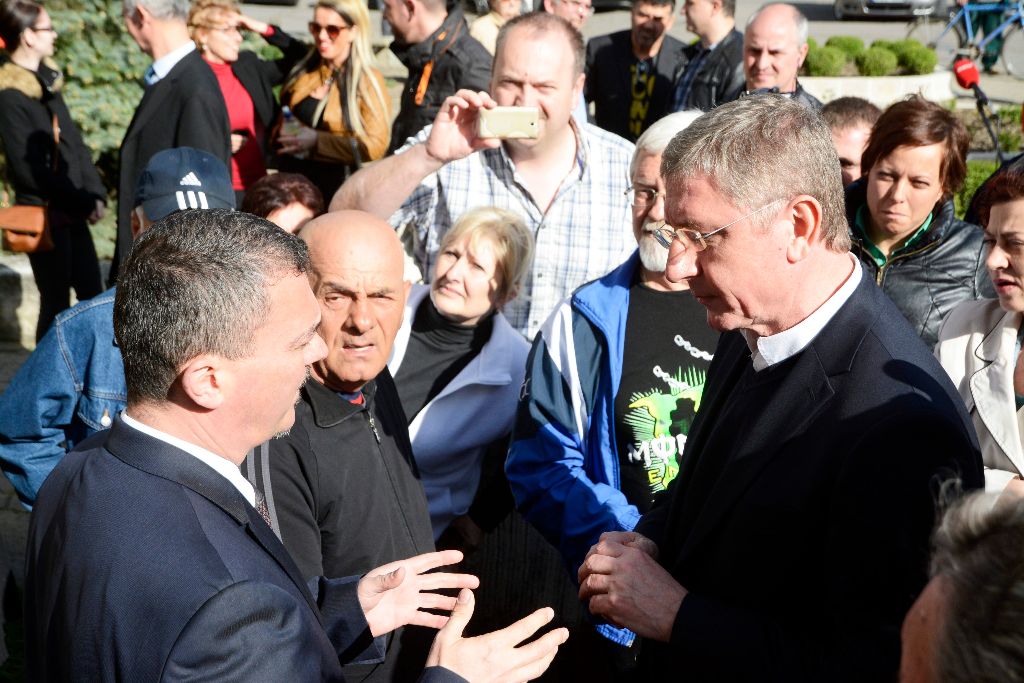 Ellentüntetõk Gyurcsány Ferenc, a Demokratikus Koalíció (DK) elnöke utcafórumának közelében Karcag fõtéren 2015. április 21-én. Gyurcsány Ferenc és a DK elnöksége a Megélhetést! Biztonságot! elnevezésû utcafórumával országjárást kezdett.