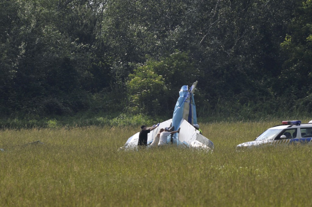 Megfordítják a lezuhant vitorlázórepülõ roncsát az esztergomi repülõtér közelében 2015. június 7-én. Leszállás közben, az esztergomi repülõtértõl 100-150 méterre ütközött össze két vitorlázórepülõ, az egyik lezuhant és a benne ülõ két ember meghalt.