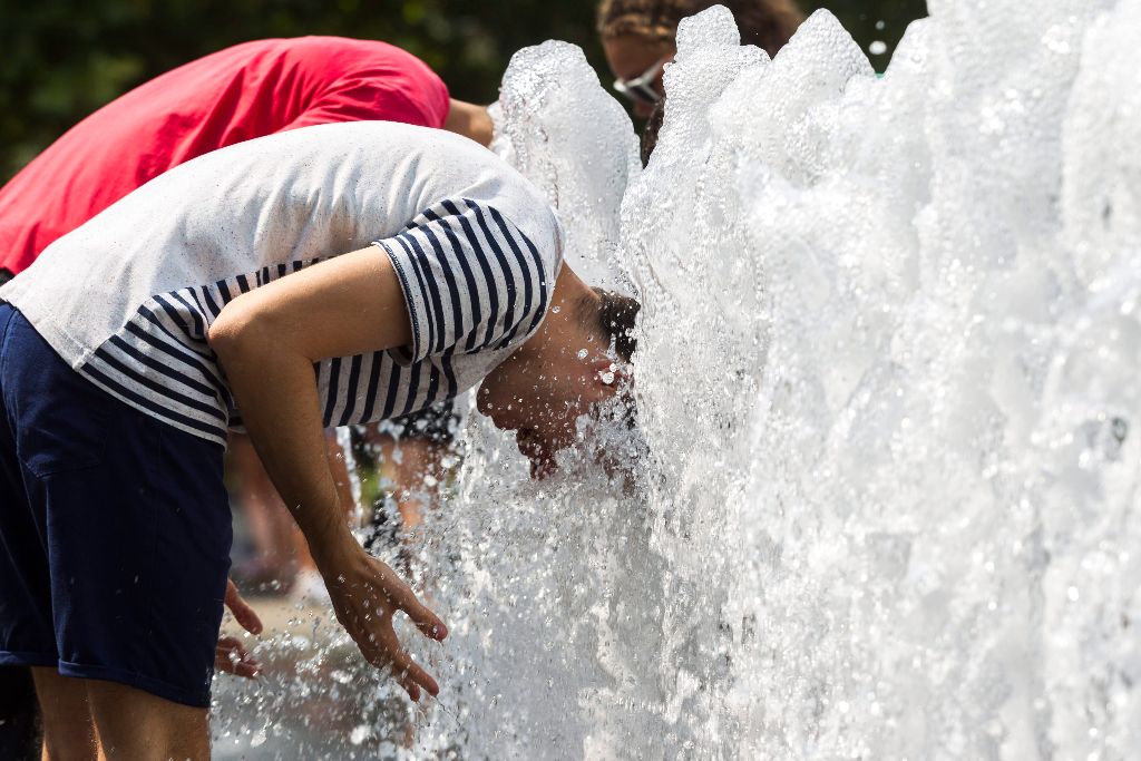 A hõség miatt a s szökõkútnál hûsölõk a Szabadság téren, Budapesten 2015. július 17-én. Erre a napra az Országos Meteorológiai Szolgálat Budapestre, Pest, Baranya, Borsod-Abaúj-Zemplén, Fejér, Gyõr-Moson-Sopron, Heves, Komárom-Esztergom, Nógrád, Somogy, Tolna, Vas, Veszprém és Zala megyére hõségriadót, vagyis a legmagasabb fokú, piros figyelmeztetést adott ki, a többi megyére másodfokút. Az elõrejelzések szerint a következõ napokban erõsödik a felmelegedés, 38-39 Celsius-fok is lehet.