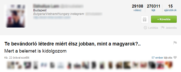 A népszerű kérdezz-felelek oldalon, az ask.fm-en is megtalálják már a Magyarországon élő, de idegen ország felmenőivel rendelkező fiatalokat. A propaganda miatt így lett már-már szitokszó a bevándorló.