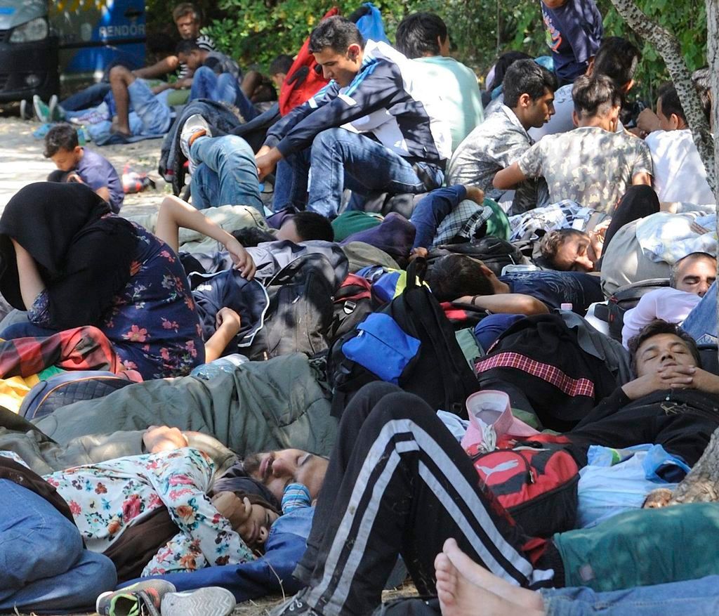 Elfogott határsértõk Mórahalom határában 2015. július 29-én. Az elõzõ napon 68 csoportban minden eddiginél több, 1524 határsértõt – köztük 260 gyermeket – tartóztattak föl a rendõrök a polgárõrökkel együttmûködve Csongrád megye déli részén.
