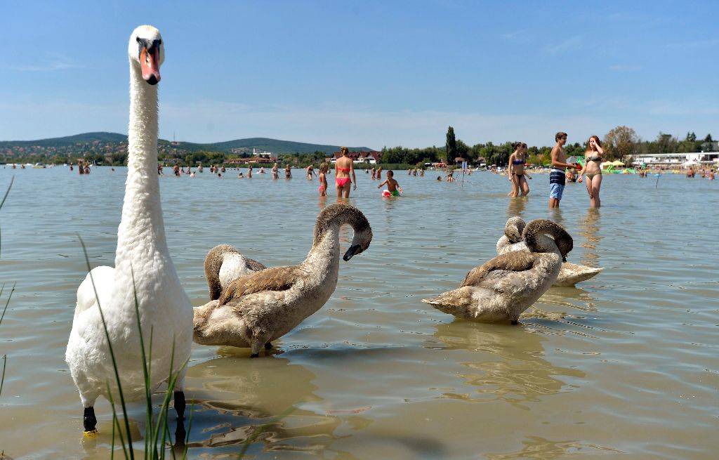 Hattyúk és fürdõzõk a Velencei-tóban a Velence Korzó szabadstrandon 2015 augusztus 1-jén. A szakhatóságok megállapították, hogy a tó partján három úgynevezett szabadstrand, vagyis természetes fürdõhely nem rendelkezik engedéllyel. A Fejér Megyei Kormányhivatal e három fürdõhely mûködtetését felfüggesztette. A tó partján tíz kijelölt, engedéllyel rendelkezõ fürdõhely mûködik, köztük a Velence Korzó szabadstrand.