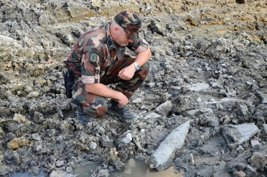Tûzszerész guggol egy 152 milliméteres szovjet repesz-rombológránát mellett a Széll Kálmán téren 2015. augusztus 24-én. A gránát építési munkák közben, a metróbejárattól 20 méterre került elõ, a gyújtószerkezet vizsgálatának idejére 150 méter sugarú körben kiürítették és lezárták a teret.