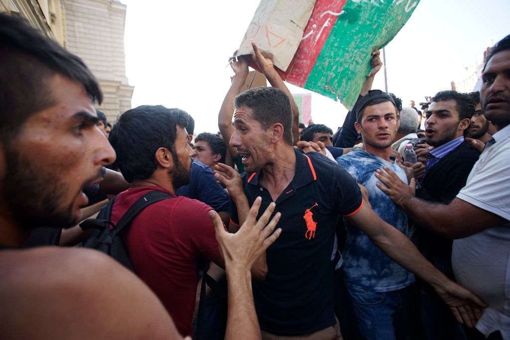 Illegális bevándorlók demonstrálnak Budapesten, a Keleti pályaudvar elõtt 2015. szeptember 1-jén, miután a rendõrség nem engedte felszállni õket a Németországba induló vonatra és kiürítette a pályaudvart.