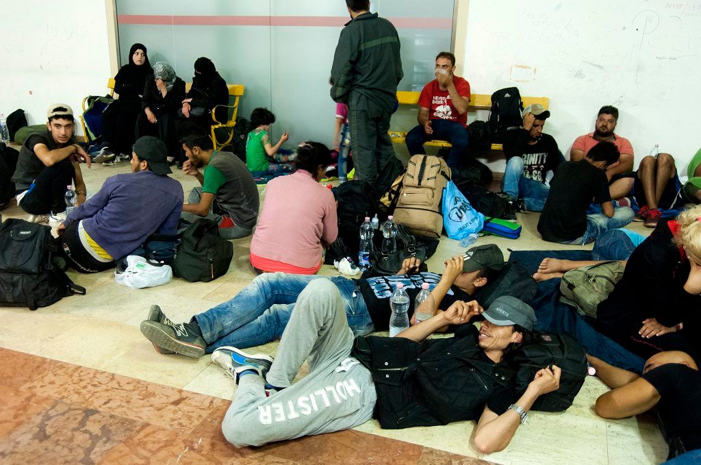 Siklósról érkezett illegális bevándorlók várakoznak a gyõri vasútállomáson 2015. szeptember 18-án.