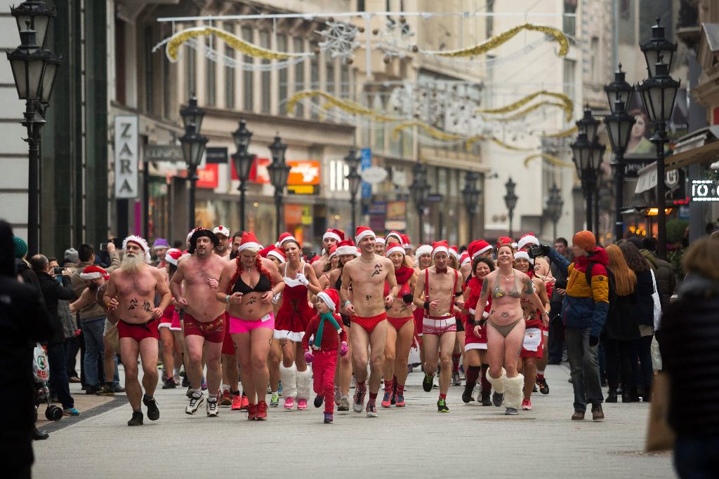 A tizenkettedik alkalommal megrendezett Nagy Mikulás Kocogás résztvevõi futnak a belvárosi Váci utcában 2015. december 13-án.