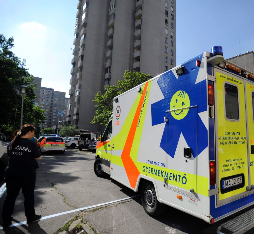 Helyszínelõk dolgoznak 2016. május 21-én a XV. kerületi Nyírpalota utcában, ahol karjában másfél éves kislányával ugrott ki egy nõ egy emeltes ház 16. szintjérõl. Mindketten életüket vesztették.