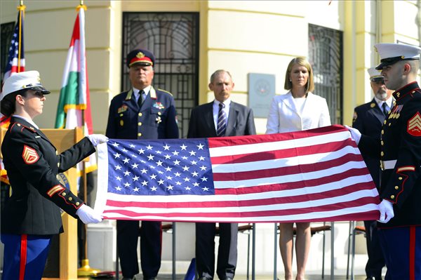 Budapest, 2016. szeptember 11. Tengerészgyalogosok összehajtják az amerikai zászlót a 2001. szeptember 11-i New York-i terrortámadások 15. évfordulóján tartott megemlékezésen az amerikai nagykövetség épülete előtt 2016. szeptember 11-én. Középen Tollár Tibor tűzoltó vezérőrnagy, a katasztrófavédelem megbízott főigazgatója, Pintér Sándor belügyminiszter, Colleen Bell amerikai nagykövet, valamint az ikertornyok elleni támadás utáni mentésben részt vevő Dan Daly amerikai tűzoltó ezredes (b-j).