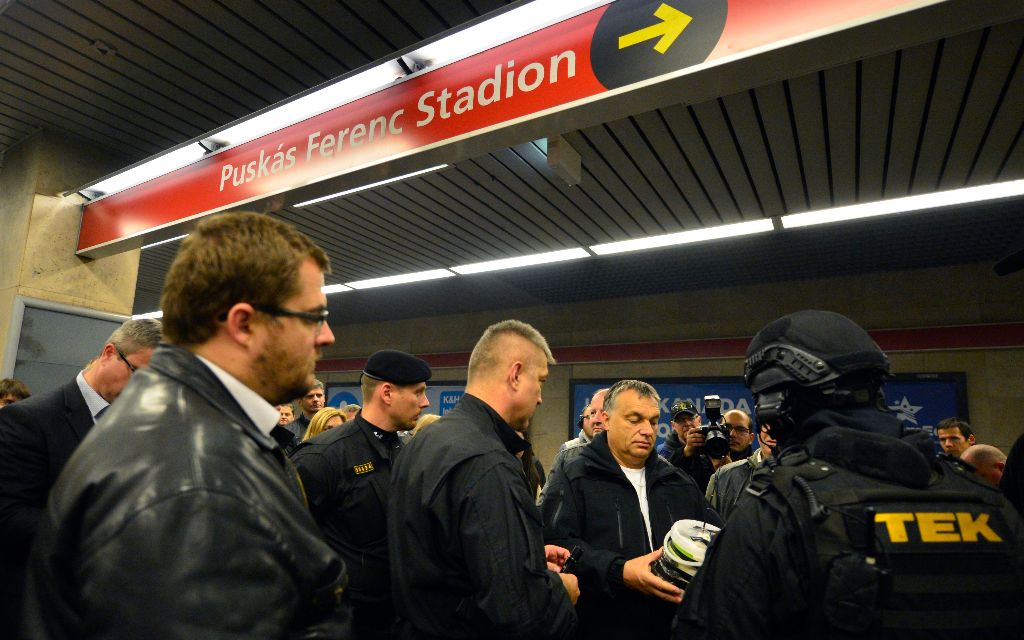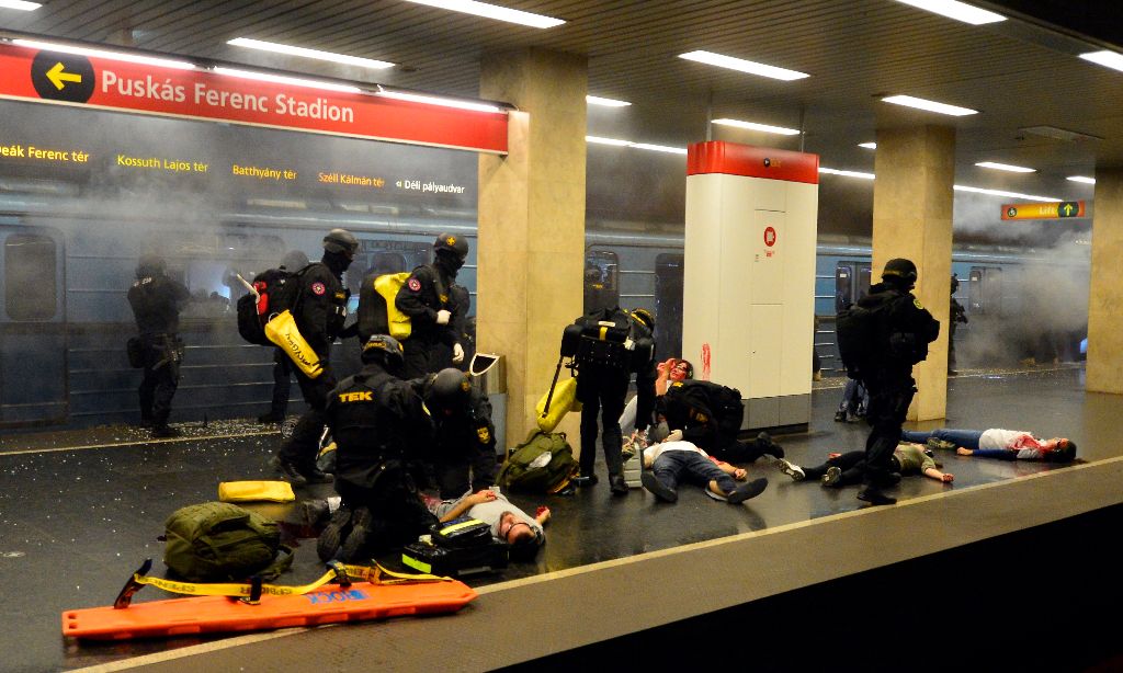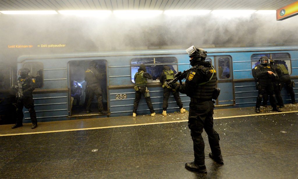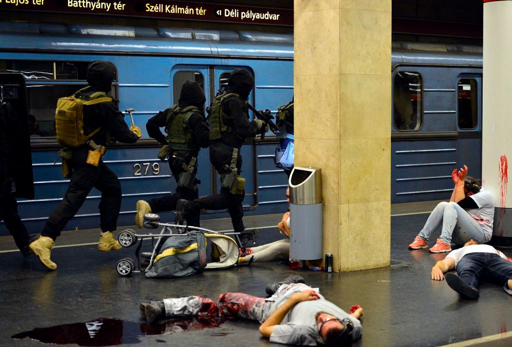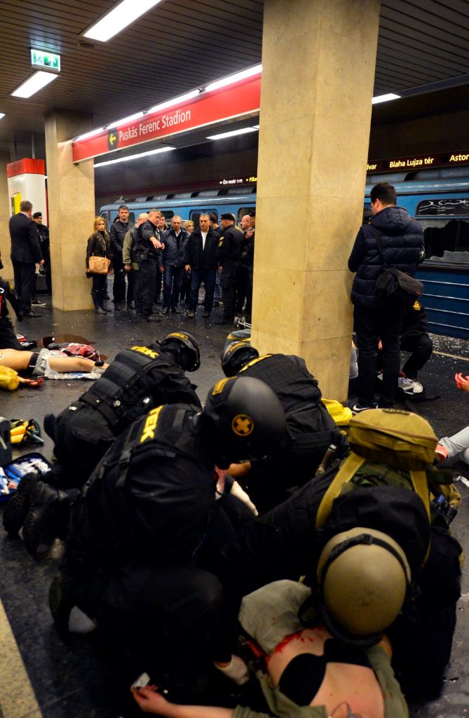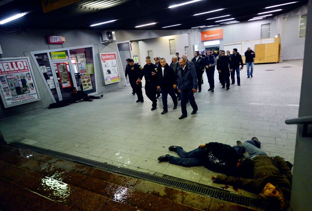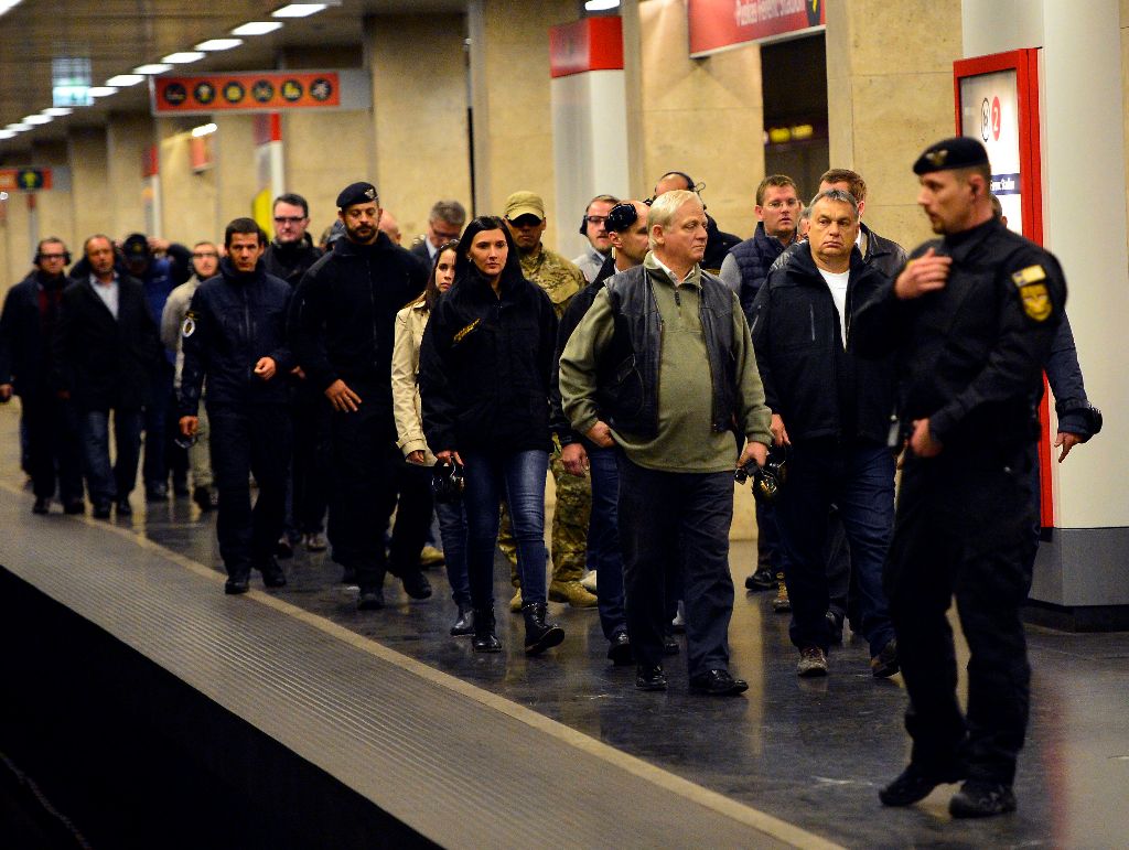Budapest, 2016. október 6. Elöl Orbán Viktor miniszterelnök (b2), Hajdu János, a TEK fõigazgatója (b), Tarlós István fõpolgármester (b3), Pintér Sándor belügyminiszter (b4) megtekinti a Terrorelhárítási Központ (TEK) terrorelhárítási gyakorlatát a 2-es metró Puskás Ferenc Stadion állomásánál 2016. október 6-án éjjel. A képen Simicskó István honvédelmi miniszter takarásban. MTI Fotó: Illyés Tibor
