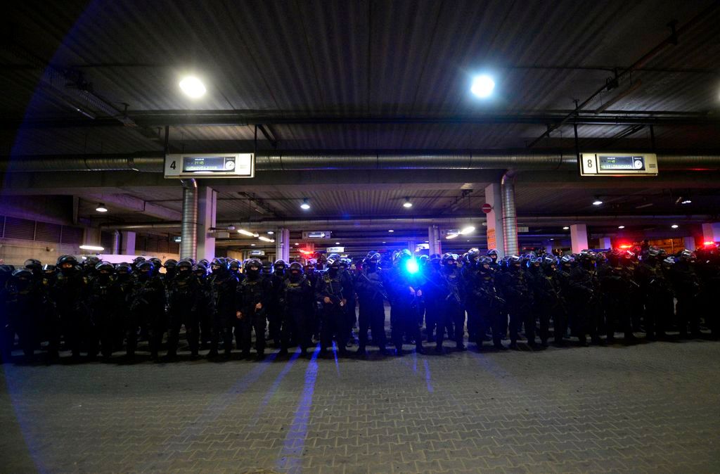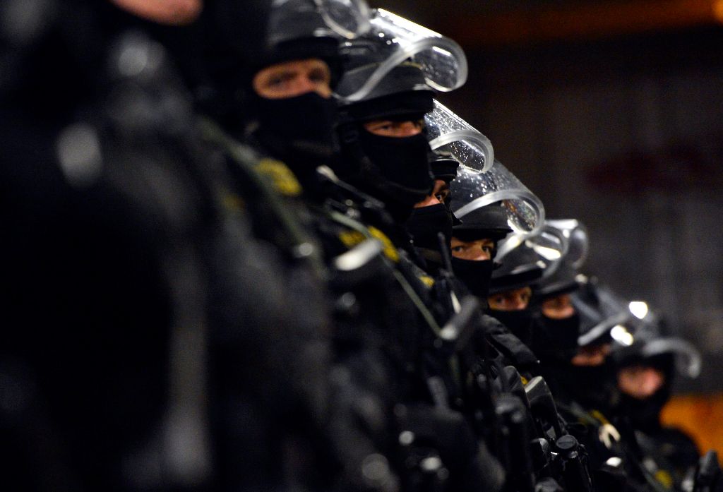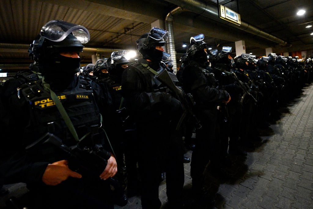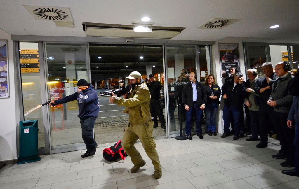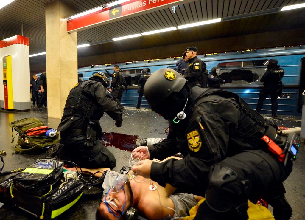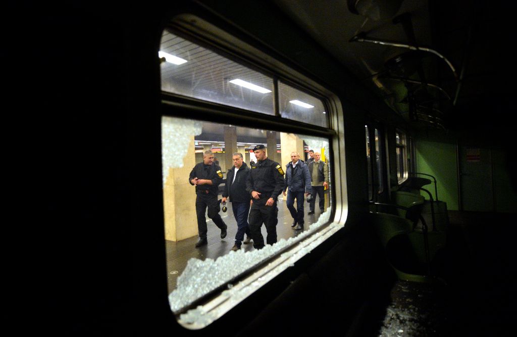 Budapest, 2016. október 6. Elöl Orbán Viktor miniszterelnök (b2), Hajdu János, a TEK fõigazgatója (b), Tarlós István fõpolgármester (b3), Pintér Sándor belügyminiszter (b4) megtekinti a Terrorelhárítási Központ (TEK) terrorelhárítási gyakorlatát a 2-es metró Puskás Ferenc Stadion állomásánál 2016. október 6-án éjjel. A képen Simicskó István honvédelmi miniszter takarásban. MTI Fotó: Illyés Tibor