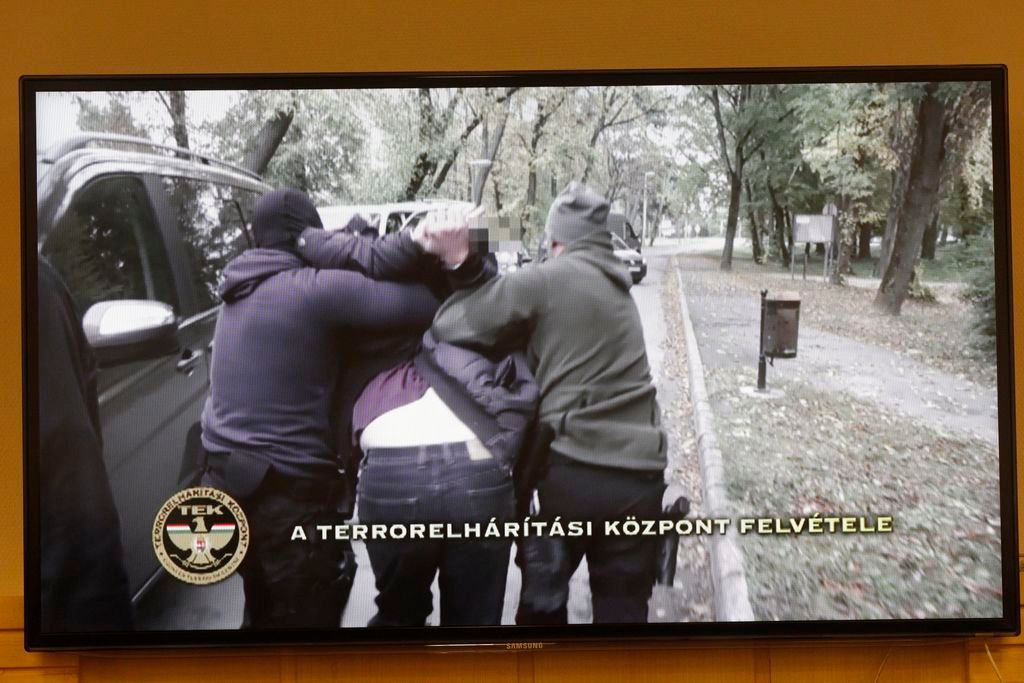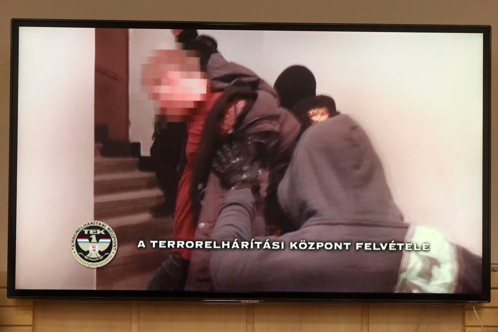 A Teréz körúti robbantás feltételezett elkövetõjének elfogásáról készült videofelvételt vetítik le az elfogást bejelentõ sajtótájékoztatón a Központi Nyomozó Fõügyészségen 2016. október 20-án. Elõre kitervelten, több emberen, hivatalos személy sérelmére elkövetett emberölés kísérletével és robbanóanyaggal visszaéléssel gyanúsított meg a Központi Nyomozó Fõügyészség egy magyar állampolgárságú, ezidáig büntetlen elõéletû fiatalembert a Teréz körúti robbantással összefüggésben.