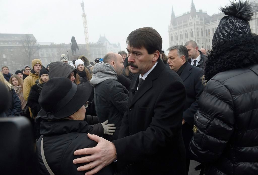 Áder János köztársasági elnök (k) és Orbán Viktor miniszterelnök (j3) részvétét fejezi ki a budapesti Szinyei Merse Pál Gimnázium tanulóinak és tanárainak az Országház elõtti Kossuth Lajos téren, ahol katonai tiszteletadással felvonták, majd félárbócra eresztették a nemzeti lobogót a veronai buszbaleset áldozataiért elrendelt nemzeti gyásznapon 2017. január 23-án. Január 20-án éjjel az olaszországi Verona közelében balesetet szenvedett egy magyar fiatalokat szállító busz, tizenhatan meghaltak, huszonhatan megsérültek. A buszon a budapesti Szinyei Merse Pál Gimnázium tanulói, volt diákok, tanárok és egyikük családja utazott.