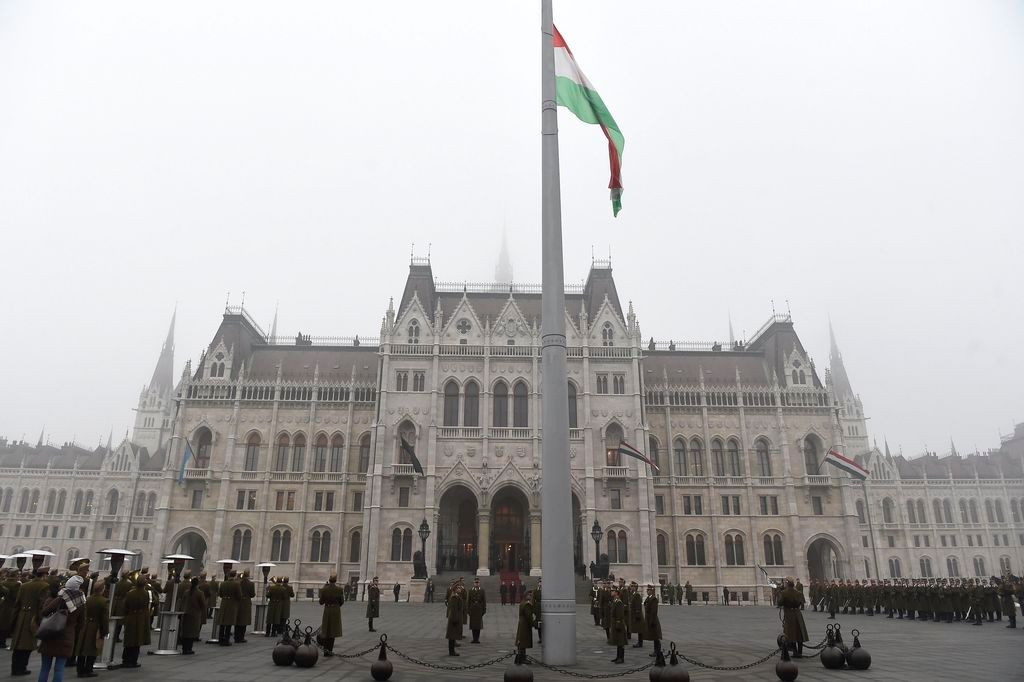 Felvonták, majd félárbócra eresztették a nemzeti lobogót a veronai buszbaleset áldozataiért elrendelt nemzeti gyásznapon, hétfő reggel az Országház előtt.