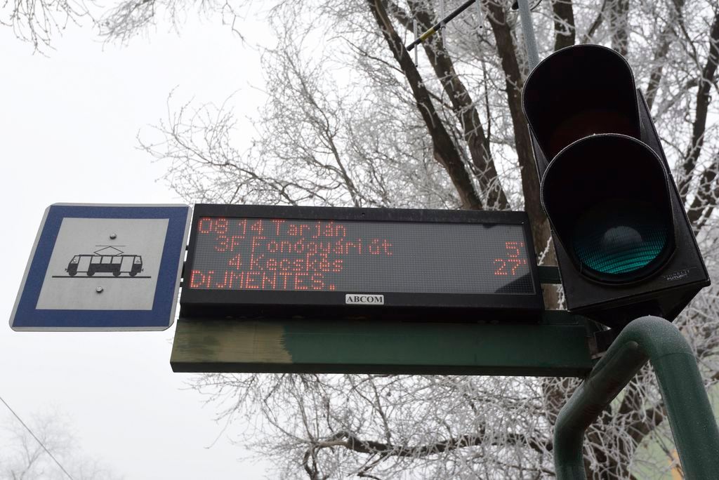 Az utasok tájékoztatására szolgáló rendszer kijelzõje egy szegedi villamosmegállóban 2017. január 24-én. A levegõ magas szállóportartalma miatt elrendelt szmogriadó miatt a városban január 24-tõl 27-ig ingyenes a helyi közösségi közlekedés. Az intézkedés napi 11,5 millió forintos költségét az önkormányzat téríti meg a szolgáltatóknak.