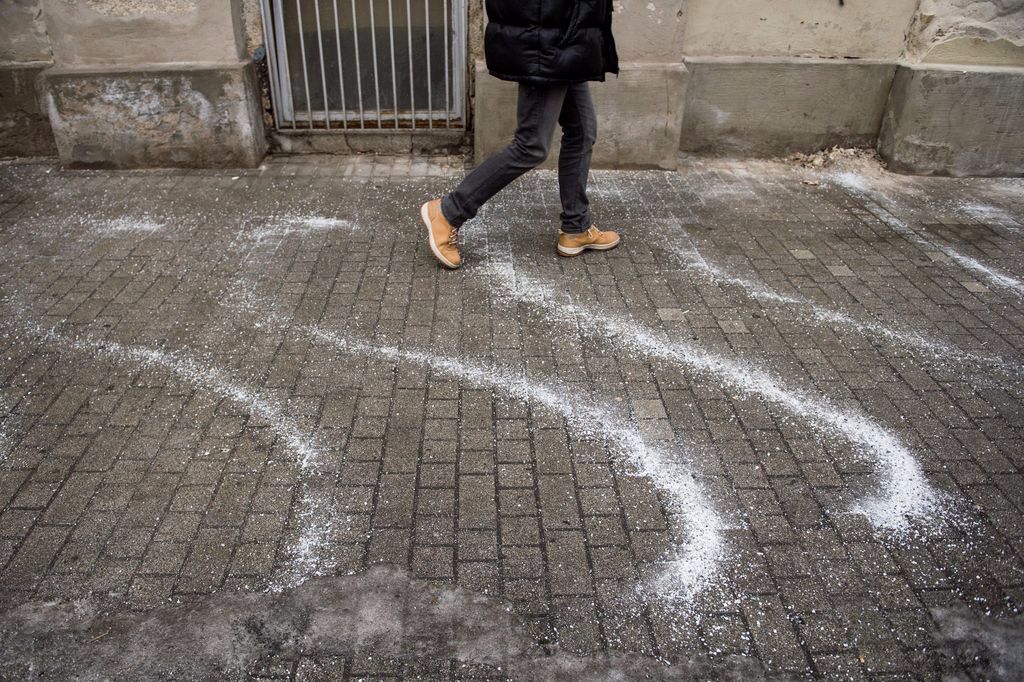 Csúszásgátló anyaggal bebeszórt járda Budapest belvárosában 2017. január 31-én. Ónos esõ veszélye miatt másodfokú (narancssárga) figyelmeztetést adtak ki Budapestre és Pest megyére, valamint Bács-Kiskun, Fejér, Komárom-Esztergom, Somogy, Tolna, Baranya és Veszprém megye területére. Békés, Csongrád, Gyõr-Moson-Sopron, Hajdú-Bihar, Jász-Nagykun-Szolnok, Vas és Zala megyében elsõfokú a figyelmeztetés ónos esõ veszélye miatt.