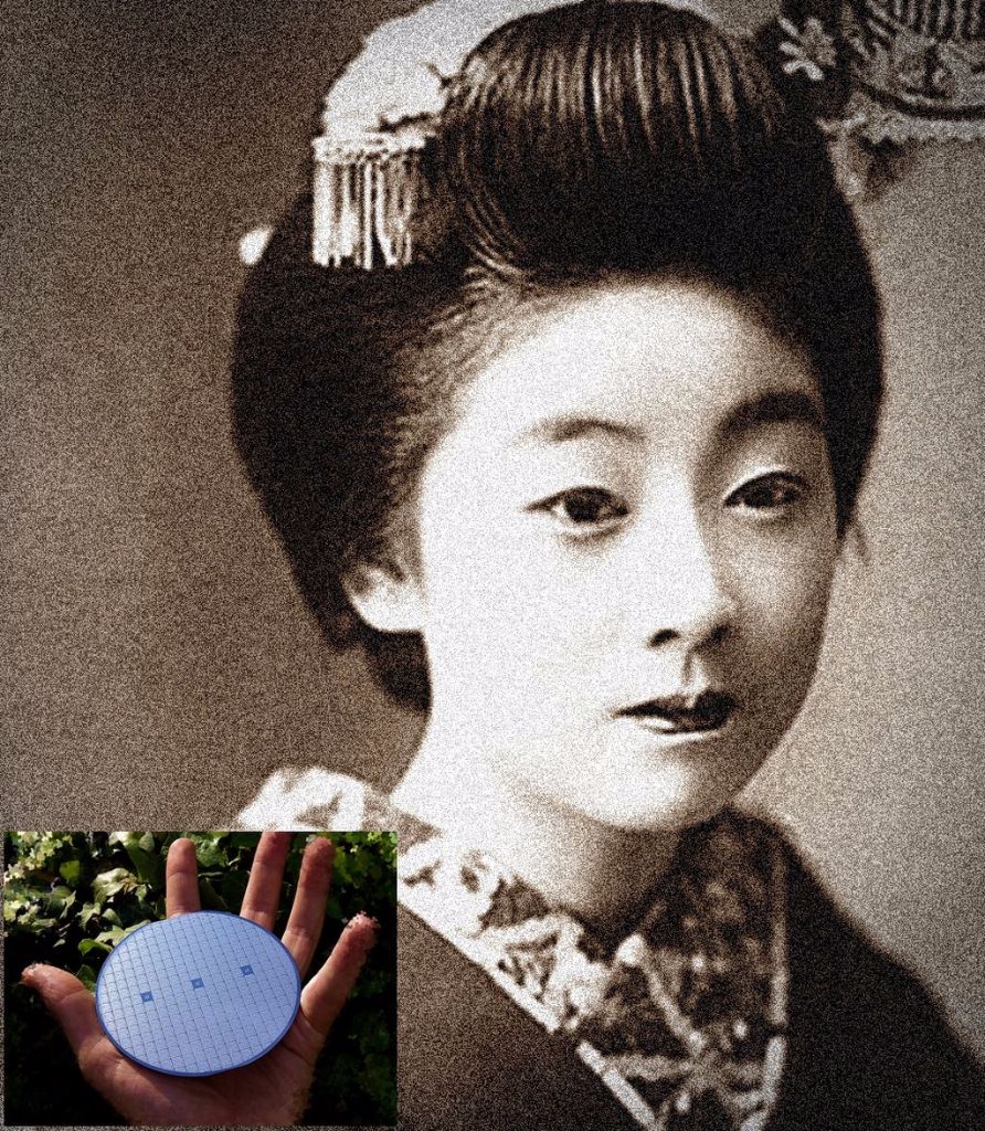 A C64 demó lemezén véletlenül találtam egy gésát ábrázoló képet. A kép fehér pontjaiból számítógép programmal elkészítettem a pattern generátor (ábra generátor) vezérlő programját. A gép a pupák pék módszerével elkészítette az első felvételt.(az első felvétel – egy áramkör eredeti méretének a tízszeres nagyítású fotója), mint egy Victor Vasarely alkotás.