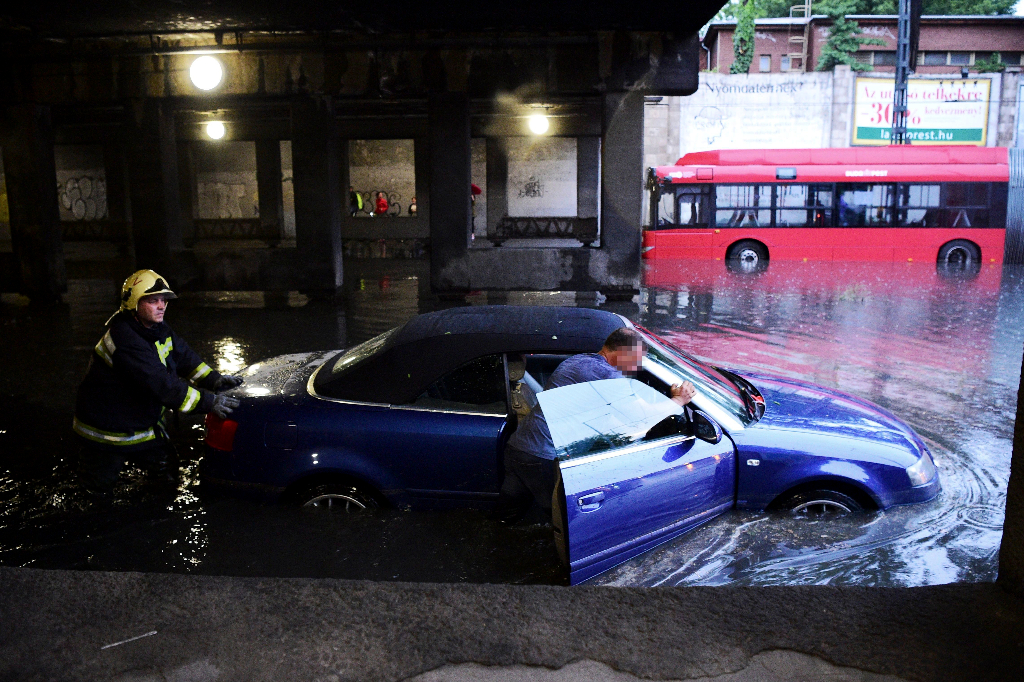 Elakadt személyautó az esõvízzel elöntött úton a Vágány utcai vasúti felüljáró alatt, a VI. kerületi Podmaniczky és a Dózsa György út keresztezõdésénél 2017. május 23-án. A fõvárosra is lecsapó vihar, a lezúduló nagy mennyiségû csapadék a város számos pontján okozott gondot, a II. és a III. kerületben is több utcát és utat elöntött a víz.