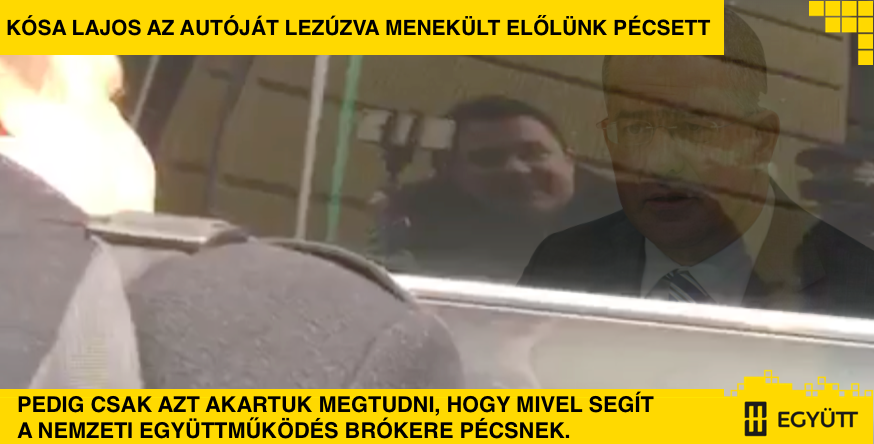 Kósa Lajos titokban Pécsre látogatott, majd a Városháza kapujában meglátta Babos Attila és Kovács István független újságírókat, valamint az Együtt velem érkezett aktivistáit, ezért nem akart kiszállni a szolgálati autójából, ami így először nekiment a városháza kapujának, utána pedig elhajtott. Pedig csak azt akartuk megtudni, hogy mivel segít a nemzeti együttműködés brókere Pécsnek. Ja, és hogy hol az 1300 milliárd.