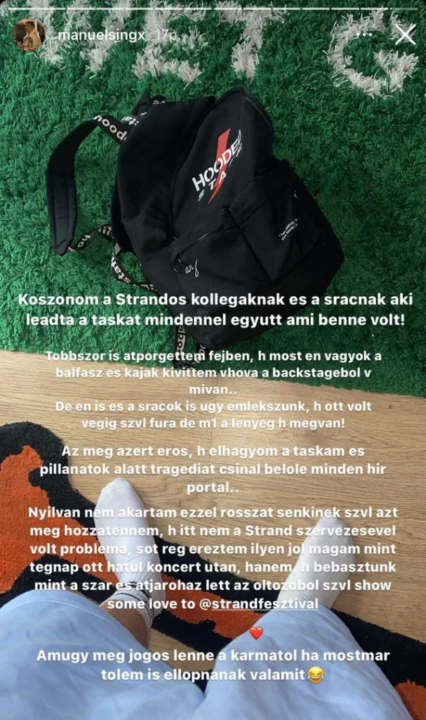 “Manuel, a Strandon mindig le kell takarni az értékeket egy törölközővel, tanuld meg….” – írta valaki frappánsan a Redditen. Manuel 1 napja jelentette be, hogy eltűnt a táskája benne 300 ezer forint készpénzzel – erre reagált a fenti poszttal a fesztivál. Megtalálták az elveszett táskáját, hiánytalanul.