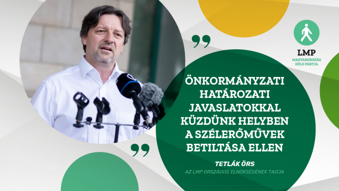 Az LMP önkormányzati képviselői helyi határozati javaslatokat nyújtanak be a szélerőművek telepítési tilalmának feloldásáért – jelentette be Tetlák Örs érdi alpolgármester, az ellenzéki párt elnökségi tagja vasárnap budapesti, online is közvetített sajtótájékoztatóján.