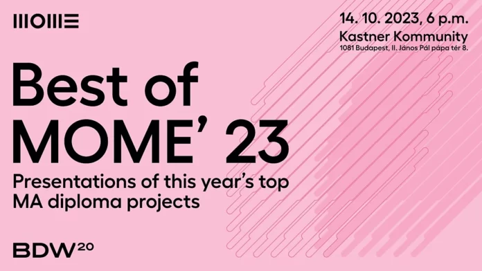 A Best of MOME ‘23 eseményen a Moholy-Nagy Művészeti Egyetem idei mesterszakos diplomaprojektjeinek legjobbjai mutatkoznak be a nagyközönség előtt, rövid prezentációk formájában október 14-én a Kastner Kommunityben. A prezentációkat a tavalyi Best of MOME előadók kerekasztal beszélgetése követi, amelyben az elmúlt időszak tapasztalatairól, aktuális projektjeikről és kihívásaikról mesélnek, az ezt követő networking eseményen pedig a résztvevők megismerkedhetnek az egyetem friss diplomásaival és az intézmény képviselőivel.